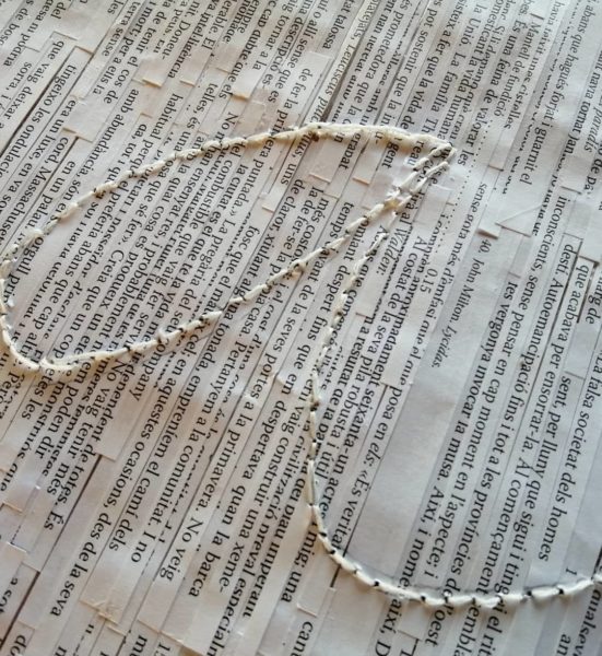 200x160cm – Paper (llibre El baró rampant*, d’Ítalo Calvino. Ed. 62) sobre manta tèrmica d’emergència i fil vermell.